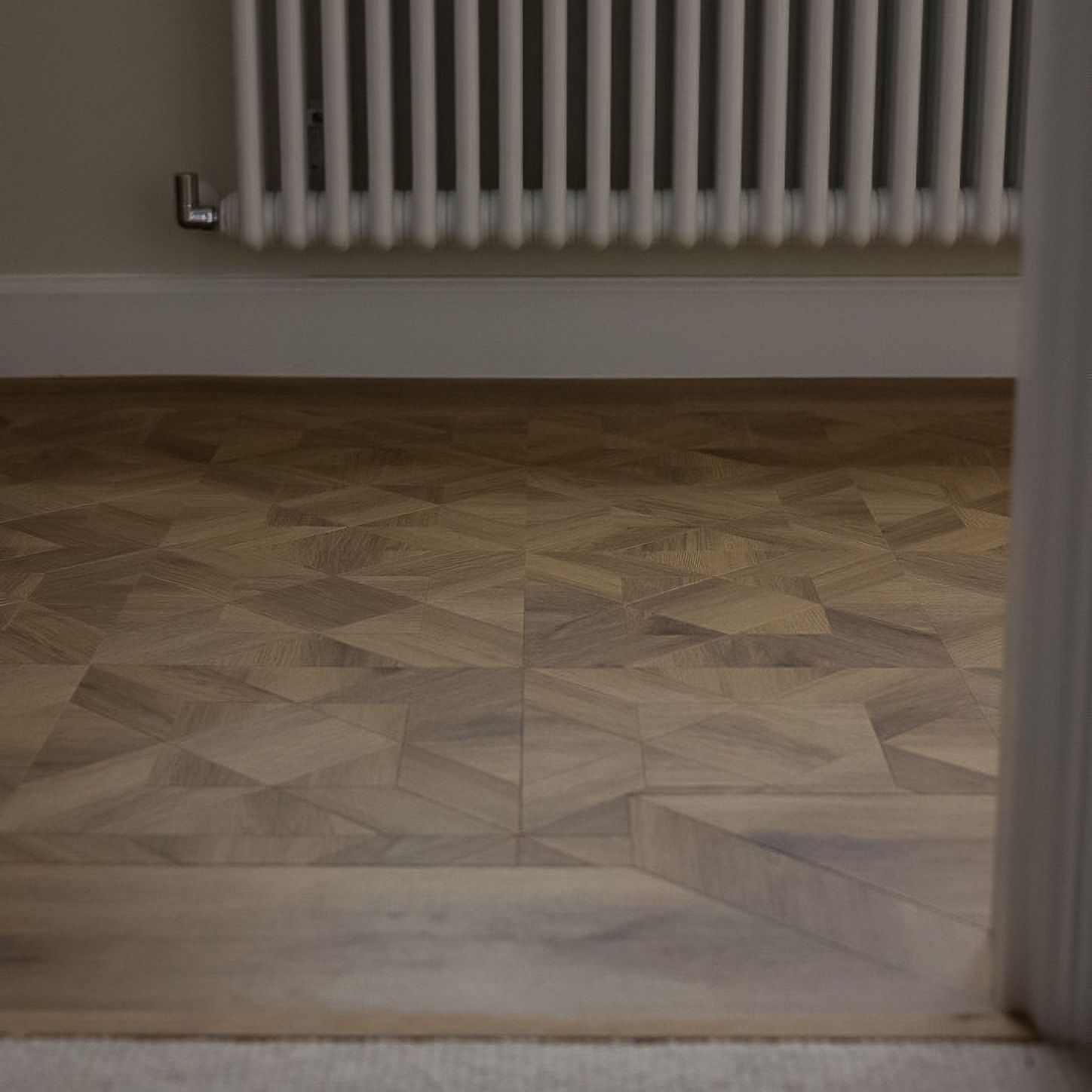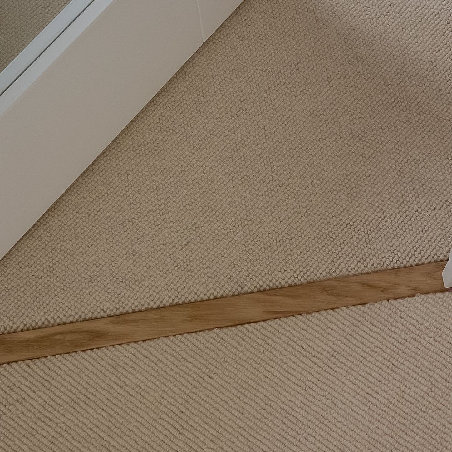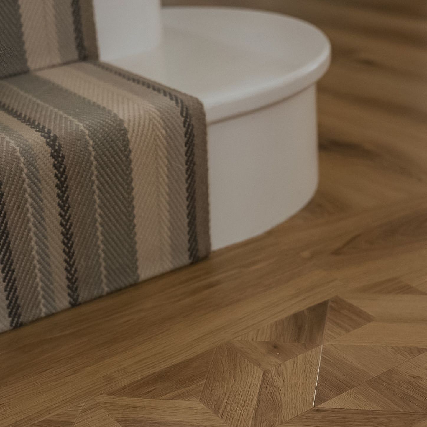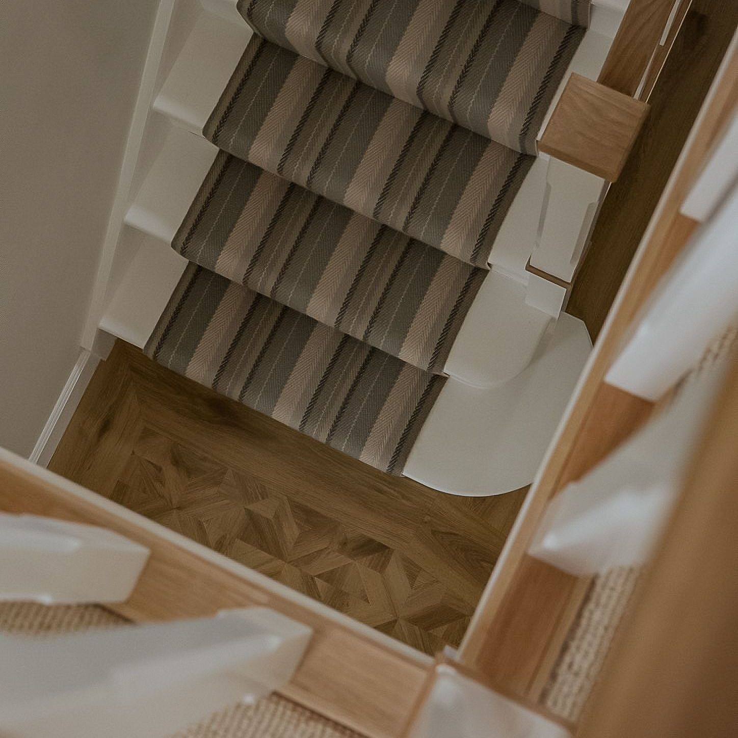 Rather than moving, the family fell in love with both the house and its serene surroundings, deciding that the best way to make it perfect for their needs was to invest in thoughtful, high-quality design. They chose Amtico LVT boards in York Oak to grace the downstairs living areas, adding warmth and elegance. The boards elegantly transition into a stunning Victorian Star pattern at the entrance, creating a welcoming focal point. To complement this, a striking Roger Oates stair runner was selected in Isis Reed to keep the neutral and timeless design, whilst still making an impact. Upstairs, the family opted for Brockway's Beachcomber carpet in Strand, which transitions into Pebble in the bedrooms and snug. This subtle change in weave was selected to accommodate the angles of the rooms, allowing the carpet to flow effortlessly throughout, while maintaining a consistent, sophisticated look across the space.